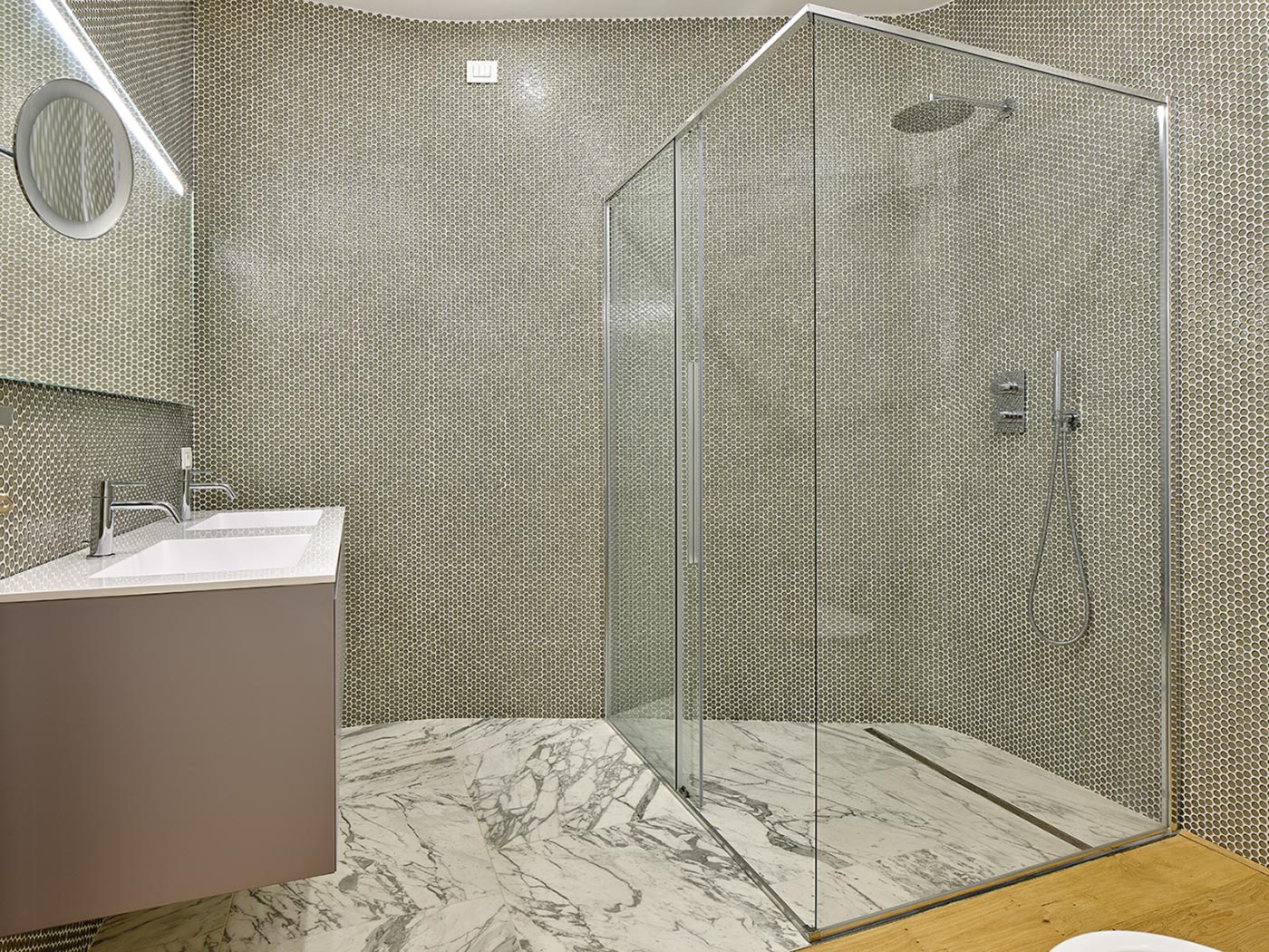La composizione della cucina enfatizza il rapporto tra le masse cromatiche in cui è stato scomposto il progetto di questa stanza: da un lato la seduta e la parete di fondo color carminio, dall’altro le linee essenziali del mobilio, tutto realizzato su misura. Il tema del convivio è stato declinato in maniera intima, volutamente minimale, attraverso un piccolo tavolo sospeso, in modo tale da ridurre al massimo gli elementi del progetto. L’approccio essenziale si rivolge anche all’illuminazione posta a soffitto, lo stesso elemento utilizzato per il soggiorno viene utilizzato in bianco, privo delle lamine dorate, in modo tale da porre qui l’accento sull’effetto luminoso più che sull’elemento che lo genera. La zona notte padronale è raccordata all’open space dall’utilizzo d’un caldo legno di rovere oliato che pervade ogni stanza fino a giungere al bagno. Anche in questa stanza ritroviamo la suddivisione per piani omogenei delle superfici: la parte iniziale in legno, la parte umida in ceramica venata e le pareti realizzate con tessere di mosaico. In tale ambito, sin dall’origine privo di finestre e segnato da angoli irregolari, si è cercato di far dimenticare la mancanza della luce naturale attraverso la realizzazione di un ambiente amniotico, molto luminoso e quasi astratto. Il tema della curva e delle superfici morbide vengono esaltate dall’artigianalità del mosaico in vetro in grado di riflettere ed impreziosire la luce artificiale generata da una pluralità di elementi tondi posti a soffitto secondo una distribuzione irregolare.
